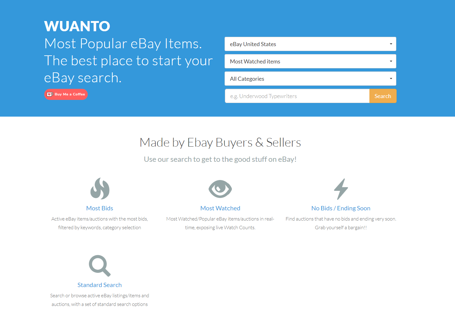 WUANTOは、eBayで売れている商品、注目されている商品(ウォッチリストに沢山登録されている)、売れずに終了した商品を様々な条件から検索できます。